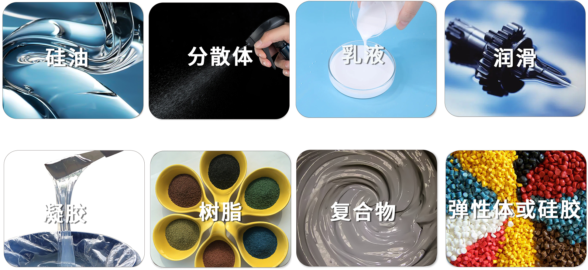 硅油及其衍生物的主要应用为:脱膜剂、减震油、介电油、液压油、热传递油、扩散泵油、消泡剂、润滑剂、疏水剂、油漆添加剂、抛光剂、化妆品和日常生活用品添加剂、表面活性剂、颗粒和纤维处理剂、硅脂、絮凝剂。