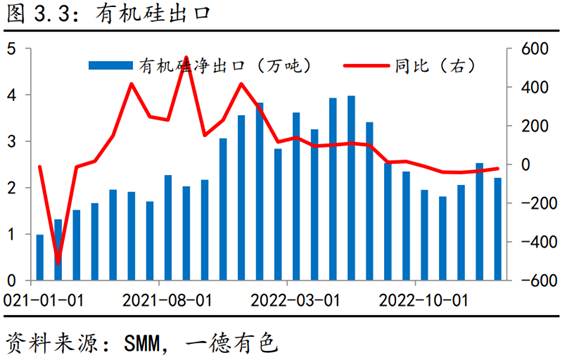 1-2月份有机硅净出口4.74万吨,同比下滑29%,净出口量自2022年下半年开始下滑也与海外消费衰退相吻合,且目前了解传统消费旺季出口依旧疲软,预计2023年有机硅净出口量30万吨左右,同比减少17%。