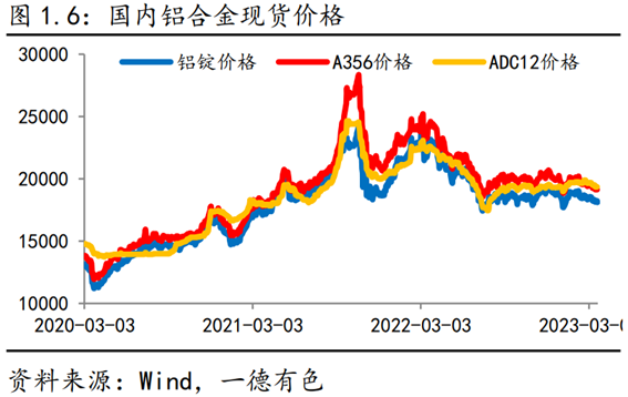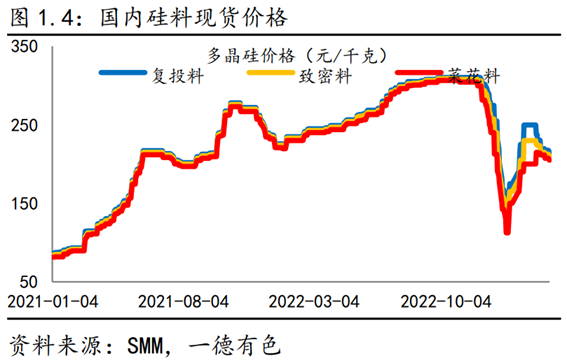 有机硅的行业洗牌仍在继续,2022年有机硅行业产量同比增长超20%,但开工率却呈现下降确实,随着过去一年新增产能的达产释放,2023年1-2月份中国有机硅产量更是创出新高,开工率也随之增加,但行业平均利润却依旧面临亏损状态。终端地产、汽车等行业消费不佳,市场情绪趋弱采购积极性不高,造成有机硅价格修复缺乏动力。多晶硅行业利润丰厚行业开工率始终维持顶部区间,因此对工业硅的消费存在保障。多晶硅虽然供应过剩的局面不改且价格出现回落,但受迫于多晶硅行业技术壁垒较高导致全行业利润保持在多晶硅板块。受海外宏观风险持续不断造成电解铝价格持续萎靡低位震荡,铝合金市场价格也随之波动,且随着废铝使用量的增加,合金行业对工业硅需求保持平稳且看不到向上的驱动。