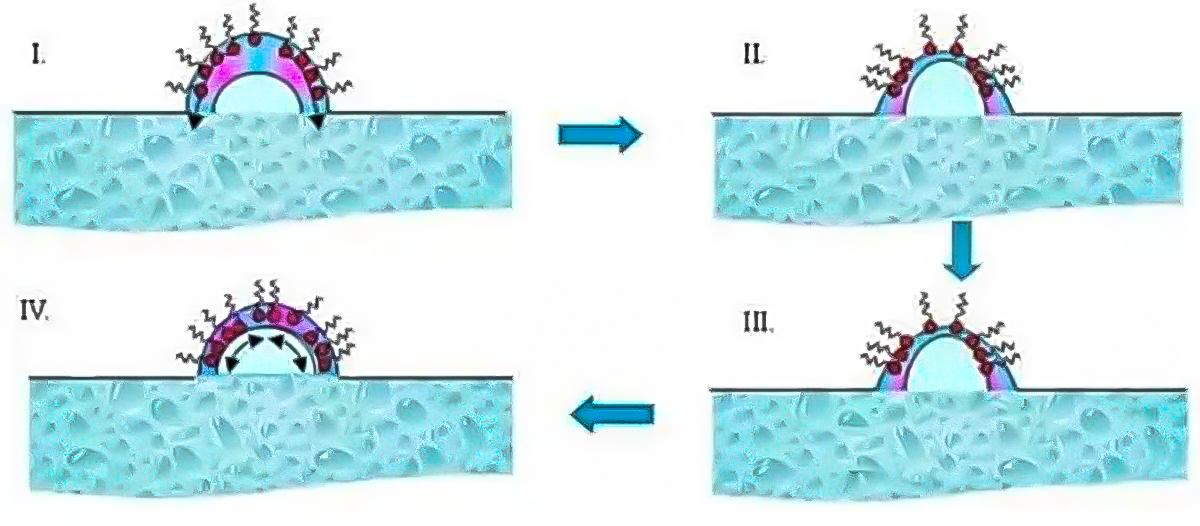 含疏水粒子的消泡剂有第三个机制。这些疏水粒子到达薄层的表面,而且在薄层的顶端吸附表面活性剂。薄层由于表面活性剂的缺失而破裂。
