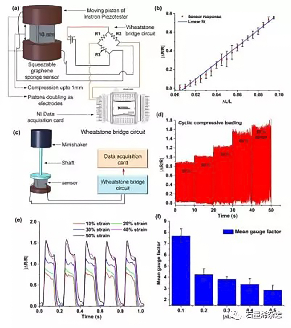 4.石墨烯-PDMS泡沫传感器表征:(a)用于进行压阻性表征实验的装置的示意图;(b)石墨烯- PDMS泡沫传感器的归一化电阻随外加压缩应变的变化曲线高达9.5%;(c)用于在10-50%范围内对较大的压缩应变进行压阻特性实验的装置示意图;(d)在不同应变下(10% ~ 50%),5种不同压缩载荷下传感器响应归一化电阻变化曲线图;(e)叠加图,显示了传感器在10%-50%五种不同压缩应变下的归一化电阻变化;(f)柱状图显示了石墨烯- PDMS泡沫传感器在10%-50%五种不同压缩应变下的计算应变因子。