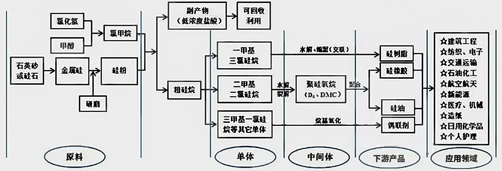 有机硅产业链非常庞大,主要包括生产原料、有机硅单体、中间体以及硅油、硅树脂、硅橡胶、硅烷偶联剂等有机硅下游产品和由这些下游产品深加工制得的新产品和新材料等部分,生产工艺十分复杂。