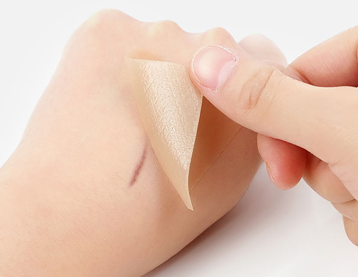 硅胶片,透明柔软但不透水,对皮肤有粘性,能够让疤痕保持一定程度的温度湿度、压力、氧气量等,以软化疤痕,预防疤痕增生,最后达到减淡疤痕的效果。