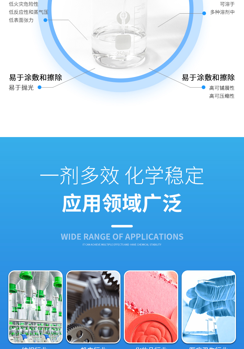 集研发,创新,生产,销售相结合,重点以生产研发有机硅新材料:以二甲基硅油、乙烯基硅油为主,以羟基硅油、有机硅乳液,氨基硅油,纺织助剂为辅的多元化化学工厂。