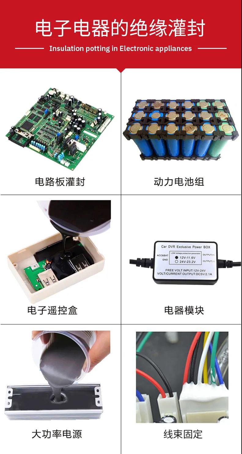 有机硅高分子材料因特殊的硅氧键主链结构而具有独特的耐气候、耐老化性能,优异的耐高低温性能,良好的疏水性机械性能、电绝缘等,因而被广泛用于电子电器元件的灌封保护。